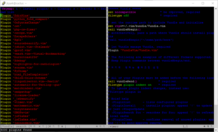 플러그인 검색 방법은 .vimrc파일을 열어 :BundleSearch 를 입력하면 플러그인 리스트가 출력된다.